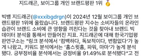 브평 1위에 긍정비율도 91%임 요새 지디 민심 데뷔이후 최고점인듯