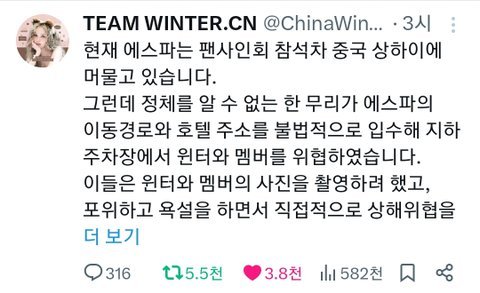 에스파 상하이 팬싸인회 일정 때문에 중국 갔는데 타악개 팬들이 숙소 위치 알아내서 거기서 기다리다가 폭언하면서 달려듬 ㅇㅇ 이미 그 그룹 중국 팬카페에 글 여러 개 올라온거 확인돼서 에스파 팬, 특히 윈터 팬들이 단체로 화나서 글 올리는 중 자잘한 계정들 뿐만 아니라 팔로워 몇 만씩 되는 네임드들도 글 올리고 있음. 윈터 네임드들은 먹금 잘하기로 유명한 사람들인데 이번 일은 그냥 넘어갈 수 없나봄. 이미 윈터 중국 팬클럽에선 본인들 아니라고 선 긋고 sm에게 항의하는 글 올려서 국내 뿐만 아니라 해외 윈터 팬들도 다같이 sm 일 똑바로 하라고 항의하고있다 진짜 sm 일 좀 똑바로 해라 호텔 위치가 왜 유출되냐고