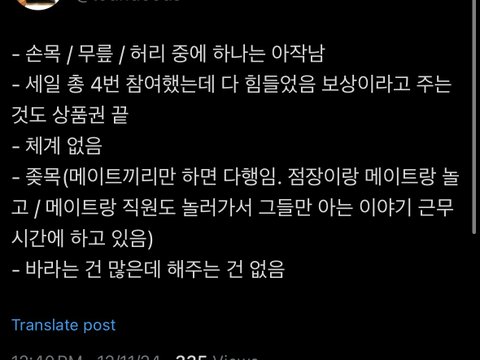 +) 올영 겉에서 볼 때는 꿀알바로 보이겠지만 안 해봤으면 함부로 말 안 하면 좋겠다. 나도 처음에는 다른 일보다 쉽겠지 하면서 시작했고 겪어보고 하는 얘기야 식당에서 12시간 동안 설거지도 해보고 청소 알바도 해보고 서빙, 공장 일도 해봤어 모든 일은 다 힘들고 굳이 비하할 필요가 있나 싶다