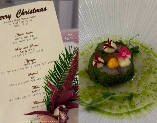 이시영 SNS'네 오늘의 메뉴'라며 소개한 메뉴판에는 전복, 캐비어, 관자, 한우를 이용한 아뮤즈 부쉬부터 스프와 빵, 방어와 연어, 문어, 스테이크, 한라봉 소르베 등이 적혀 있다.