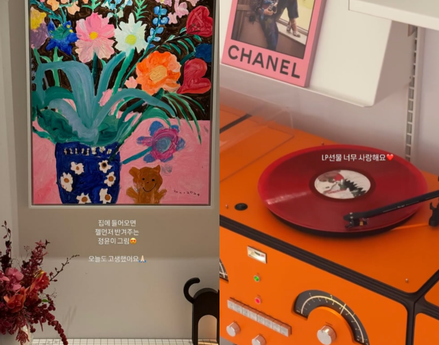 이시영은 아들이 그린 그림과 세련된 크리스마스 트리, 와인과 케이크, 꽃, LP 등 홈파티 곳곳을 선보였다.