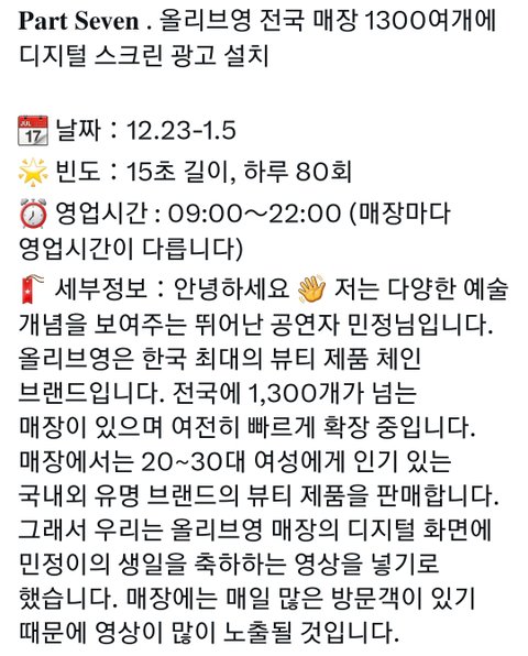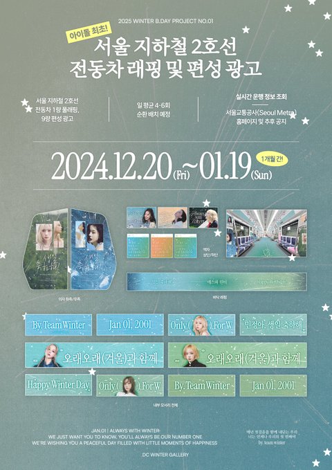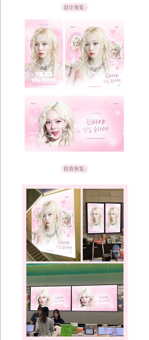 곧 1월 1일 윈터 생일이라 중국 팬클럽에서 이벤트 여는 중인데 오늘 뜬게 진짜 대박임 12월 23~1월 5일까지 2주동안 전국 올리브영 매장(약 1300개)에 디지털 스크린 윈터 생일 광고 띄워놓는다고 함 이외에도 서울 각종 지하철역이랑 버스정류장에 윈터 사진 엄청 걸어두고 무슨 벽화도 만들었던데 아직 이벤트가 한참 남은게 ㄷㄷ 진짜 중국 팬들은 돈 쓰는 스케일이 다른 것 같다.. 국내 팬들도 아이돌 최초로 2호선 지하철 대여한 다음 윈터 사진이랑 글귀로 장식해서 운영한다고 하던데 팬들이 모금을 되게 잘하는 것 같음