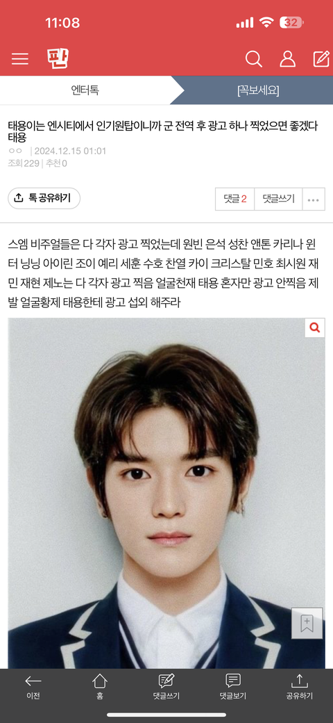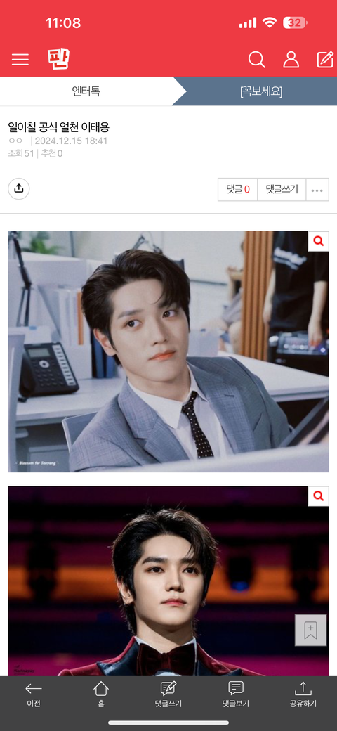 내가 쓴 왜 엔시티 태용글에 관심도 안 하고 댓글 안적어? 그리고 내가 쓴 태용 글에 반대가 2개나 있더라 왜그러지? 태용팬들 어디갔음 다들? 떨어져 나갔나? 난 툥프라서 툥프들 다 떨어질까봐 불안해 ㅠㅠ 그리고 이 3개글 찾아서 꼭 보라 제발