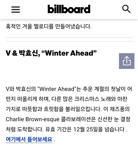 빌보드 선정 겨울송에 뷔 박효신 Winter Ahead 선정됨