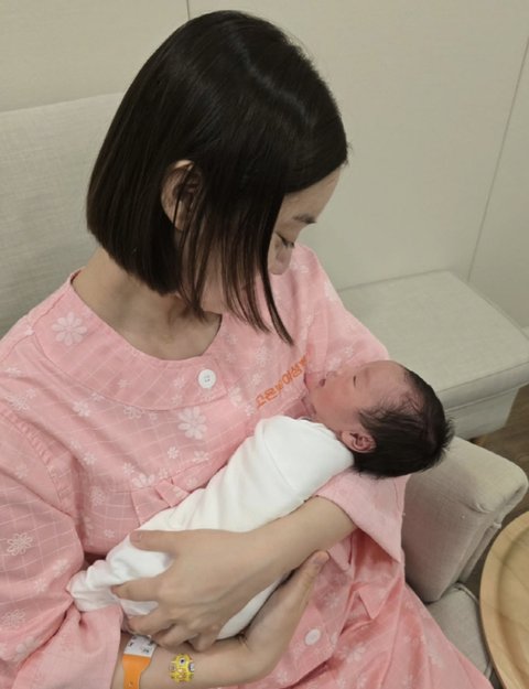 사진 속 우혜림은 아들 '땡콩(태명)'을 안고 감격해하고 있는 모습. 눈도 못 뜨는 신생아를 보며 흐뭇한 미소를 짓고 있다.