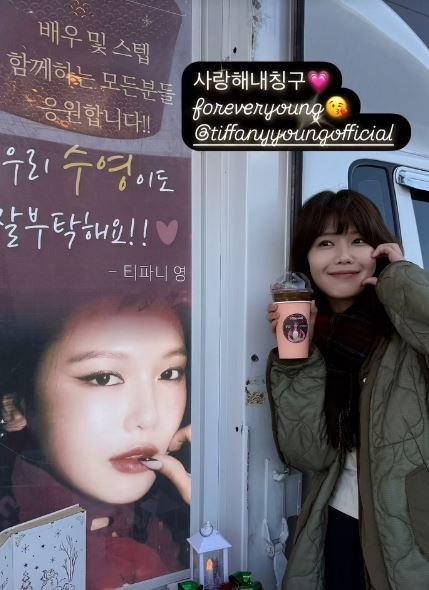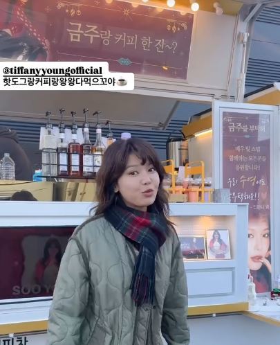 사진=수영수영에게 커피차를 보낸 건 바로 소녀시대 멤버 티파니 영. 수영은 "오늘의 감동파니"라며 "핫도그란 커피랑 왕왕 다 먹으꼬야"라고 적었다. 또 활짝 웃으면서 즐거워하는 영상을 올려 화답했다.