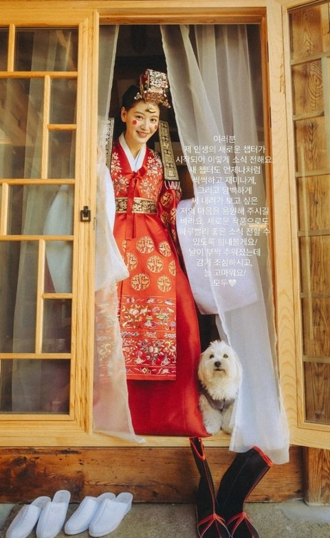 새신부의 아름다운 모습이 담긴 사진도 함께 공개했다. 공개된 사진 속 김재경은 전통혼례의상을 입고 한옥에서 환한 미소를 짓고 있다. 옆에는 그의 반려견 마카롱이 함께 서 있어 보는 이들을 미소짓게 한다.