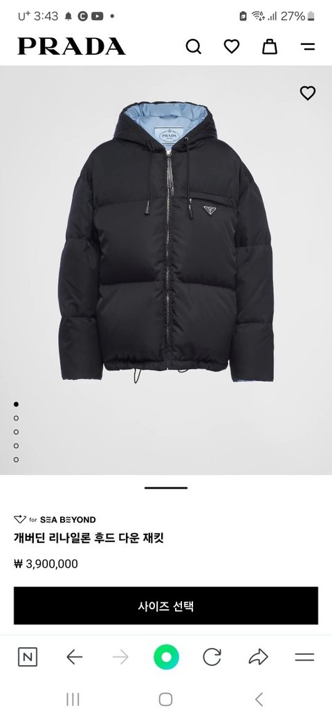 신세계 죽전점 개버딘 리나일론 후드 다운 자켓 390만원이였고 무슨 할인 이라해서 20만원정도 할인 받은 걸로 기억해요. 딸과 남편은 몽클레어에서 패딩을 각각 구매하고 저는 몽클이 있는지라 프라다에서 처음 패딩을 구매해봤어요.몽클에서 살걸 ..후회중입니다.