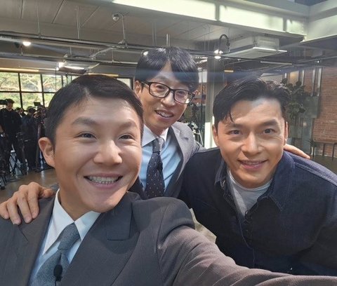 사진은 조세호, 유재석이 '유퀴즈' 게스트 현빈과 녹화를 마치고 셀카를 남기는 모습이 담겨있다. 현빈의 잘생긴 외모가 눈길을 끌었다.