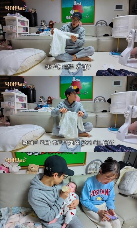 분유를 타서 주자 겨우 울음을 그친 서우 양. 장수원은 "밥 먹고 바짝 1시간-1시간 반 기분 좋다"며 그 틈을 노려 패션쇼를 시작했다.