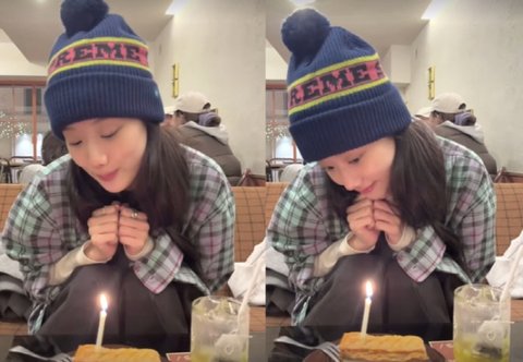 19일 이나은은 작은 케이크 앞에서 수줍은 듯 표정과 포즈를 취하며 초를 불고 행복해 했다.