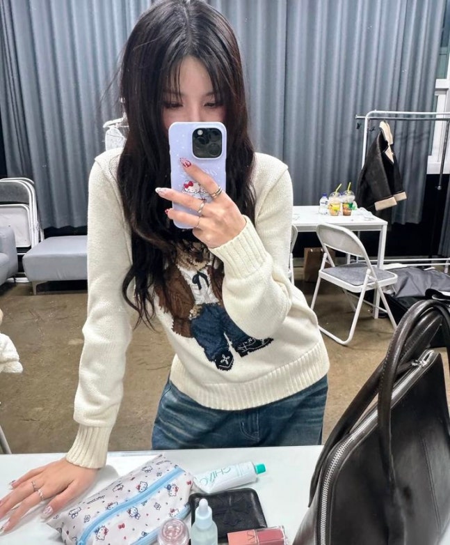 공개된 사진 속 권은비는 곰인형이 그려진 스웨터를 입고 셀카를 찍었다.