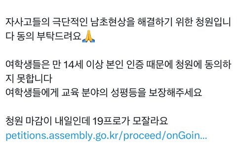 여학생들의 교육분야의 성평등 보장, 조금이라도 공학 내의 성범죄 규탄을 위해서라면 자사고 여고를 늘리거나 자사고 남고를 남녀공학으로 전환시켜달라는 이 중요한 청원 동의부탁해!!
