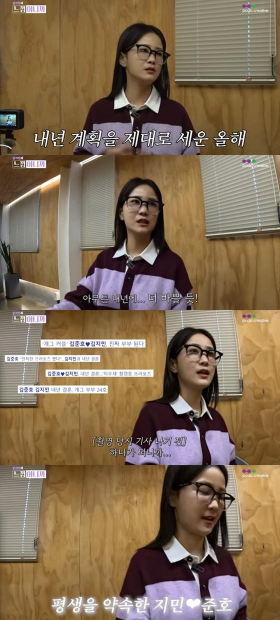 김지민/사진=유튜브 김지민의 느낌아니까코미디언 김지민이 김준호와의 내년에 결혼할 것이라고 인정했다.19일 유튜브 채널 '김지민의 느낌아니까'에는 '연애썰부터 로또 번호까지..! 김지민의 Q&A'라는 제목의 영상이 올라왔다.