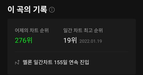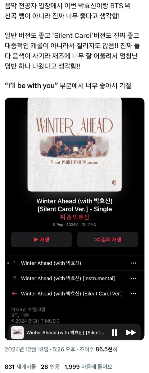 그럴만한게 하트수도 14만 넘고 지금도 날마다 하트수 증가하는중임 12월 되면 탑백 차트인까진 아니어도 역주행함 21년도 12월24일 발매인데 지금 일간 276위임 꾸준히 대중들이 듣고 있다는거지 ㅎㅎ 발매 당시에도 반응 터졌었고 커버곡도 많았고 매년 12월 마다 순위 상승함 꼭 들어봐봐!!
