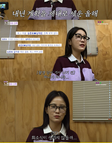 김지민은 김준호와 내년 결혼 계획을 직접 밝혔다. 김지민은 "올해가 제일 시간 빨리 갔다. 마음이 따뜻한 날들이 많았다"며 "또 건설적으로 남친과 내년 계획을 제대로 세운게 처음이라서..내년에 희소식 생기지 않을까"라고 결혼 계획을 전했다. 그러면서 "둘이 하나가 되니까 좋은 소식이 생기지 않을까"라고 얼굴을 붉혔다.