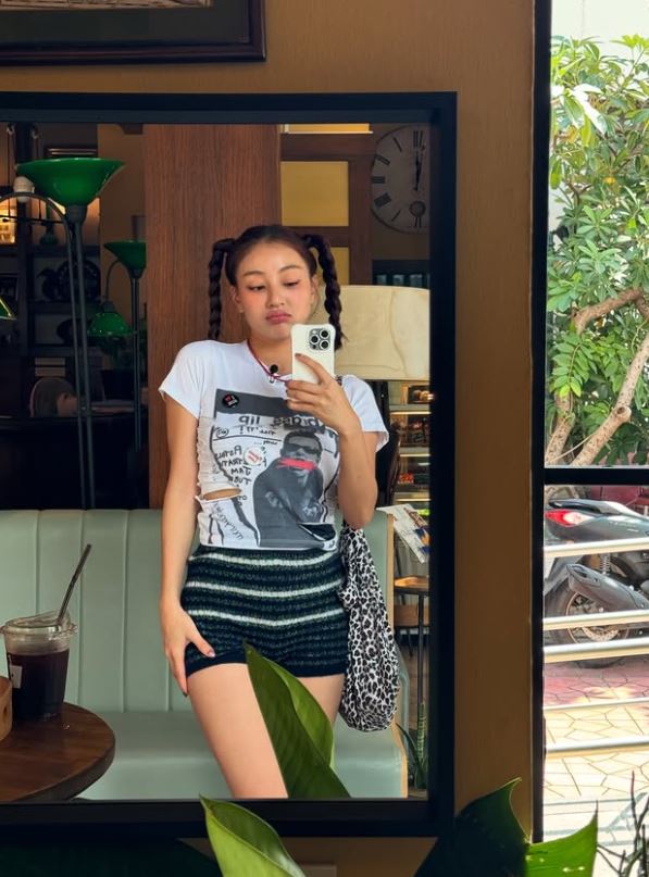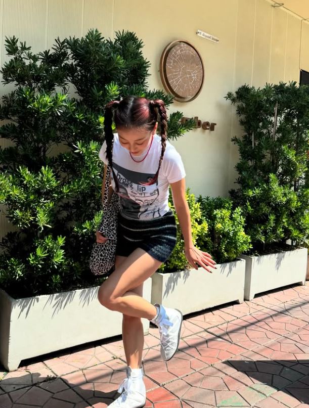 또 다른 사진에서는 양갈래 머리로 귀여움을 한껏 발산했다. 미니스커트를 입고 거울 앞에서 셀피를 찍으며 늘씬한 각선미를 과시하기도 했다.