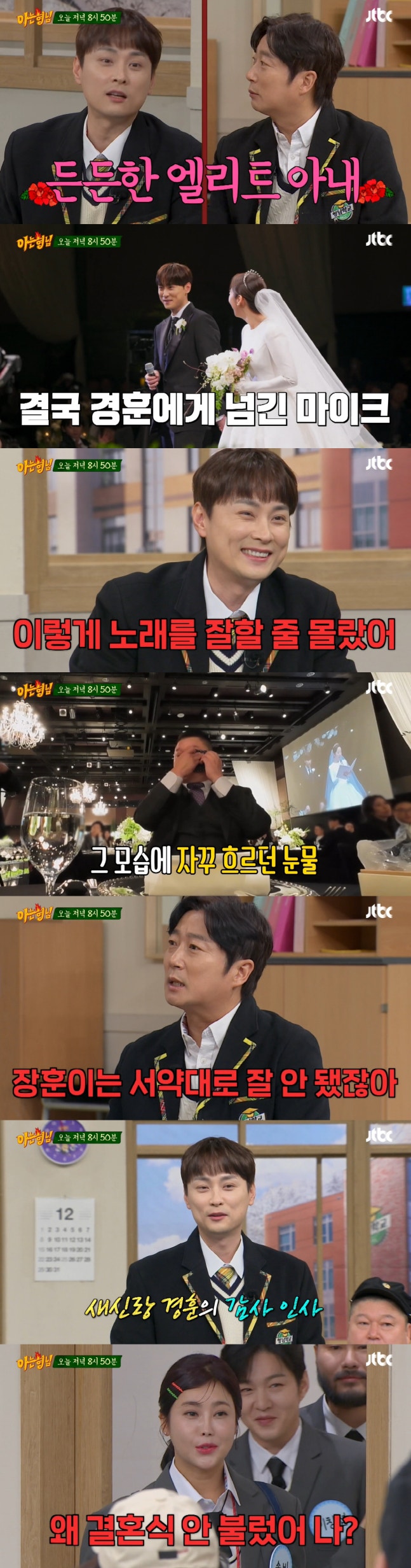 또한 강호동과 서장훈은 민경훈의 결혼식에서 눈물을 쏟았던 이유를 밝혔다. 강호동은 "다 기쁨의 눈물이지 않냐. 내가 만났던 동료 중에 경훈이만큼 담대한 사람이 없다. 근데 긴장한 뒷모습을 보니까 눈물이 났다"고 말했다. 서장훈은 "울 일이 아닌데 서약서 읽는데 (눈물이 났다)"고 털어놨다. 이에 이수근은 "서약서대로 잘 안돼서 그런 거다"라고 놀려 웃음을 자아냈다.민경훈은 많은 관심과 사랑을 가져준 시청자들에게도 감사 인사를 전했다. 그는 "우선은 너무 많은 분들이 관대한 사랑을 주셔서 성황리에 결혼을 마쳤다. 너무 감사드리고 신혼여행 가 있을 때도 한국에서 온 다른 신혼부부들을 많이 만났다. 그분들도 다시 한번 결혼 축하드린다고 말씀드리고 싶다"고 말했다.