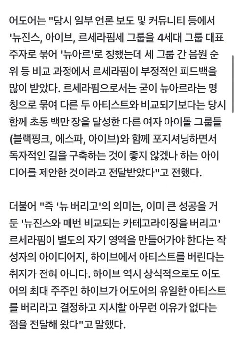 결론: 더쿠,켚갤이 뉴아르라는 용어를 욕함-> 하이브가 그런 부정적 반응을 보고 뉴아르의 ‘뉴’라는 단어를 (떼)버리고 다른 카테고라이징 하려고 한다는 문서를 씀-> 그 문서를 보고 더쿠,켚갤이 뉴진스 버린다 했다고 욕하는중 ㅋㅋ