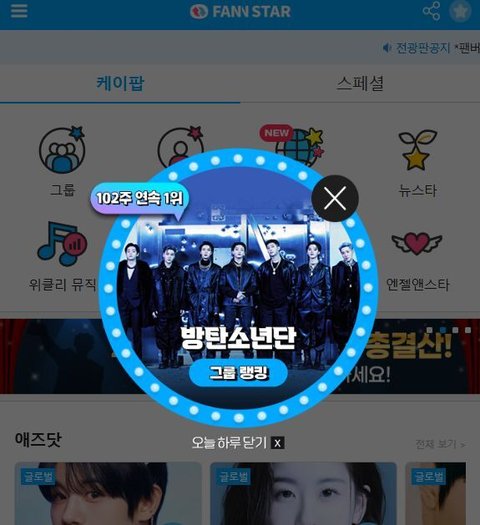 팬앤스타 어플 그룹툽 지금 역전됨 103주 1위 위험해