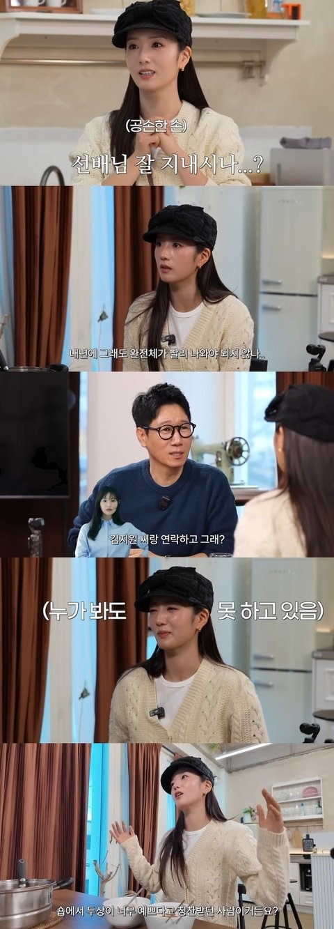 윤보미의 요리를 먹으며 이야기를 나누던 중 그가 출연했던 '눈물의 여왕'도 거론됐다. 지석진은 "첫 회 보니 안볼 수가 없겠더라"며 "처음에 네가 딱 나오는데 너인 줄 몰랐다. 그때부터 조마조마했다. 잘해야 하는데. 그런데 너무 잘해서 뿌듯하더라. 녹화장에서 하하랑 그 얘기 했다. '보미 나오는 거 봤니?' 하니 '형 너무 잘하죠' 하더라. 있었던 대화다"라며 칭찬을 이어갔다.