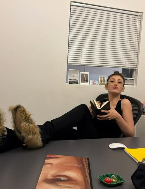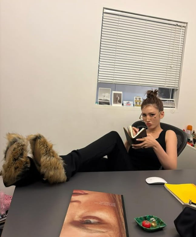 공개된 사진들 속에서 전소미는 검은색 나시 상의에 같은 색의 긴 바지를 착용하고 털이 가득한 구두를 책상 위에 올린 채 다양한 포즈를 취하고 있는 모습.