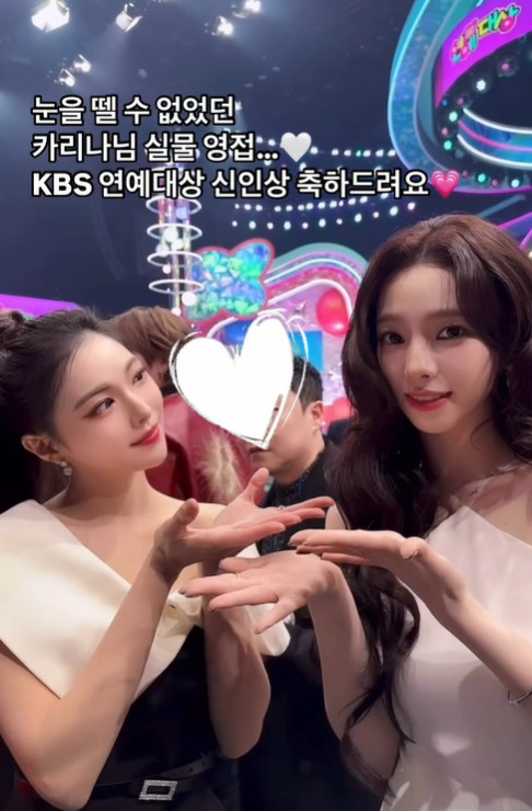 평소 '서울대 카리나', 'KBS 카리나' 등 카리나 닮은꼴로 거론됐던 정 아나는 공개된 영상 속에서 지난 22일 방송된 KBS '연예대상'을 통해 만난 카리나와 따로 추억을 남기고 있는 모습. 특히 두 사람은 우열을 가릴 수 없을 정도로 아름다운 미모를 뽐내고 있어 눈길을 끌었다.