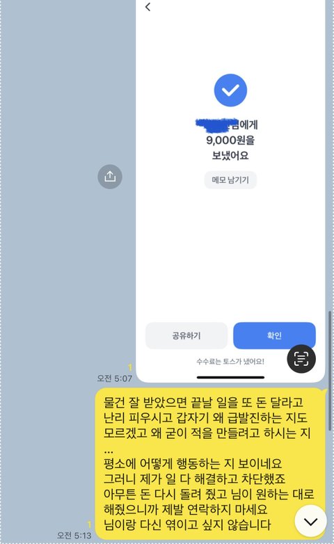 9천원이면 큰 돈도 아니고 안 주면 또 끝까지 쫓아와서 저럴 것 같아서 돈 받고 떨어지라는 식으로 주고 다시 차단했습니다