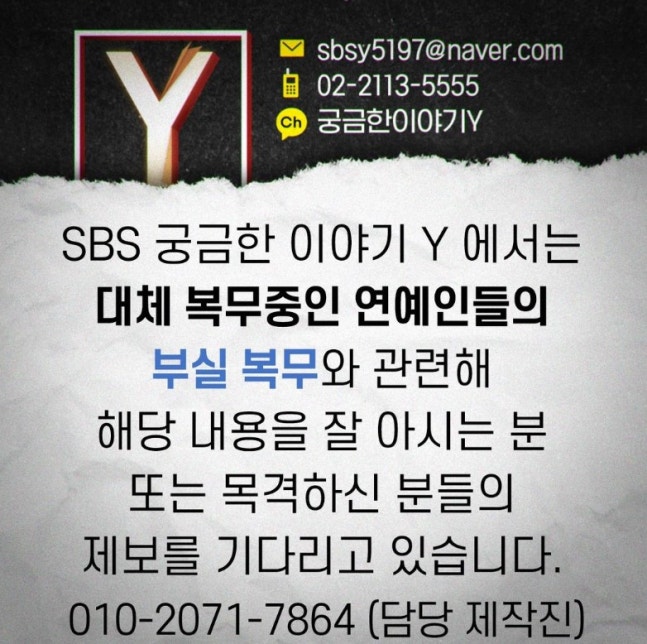 23일일 SBS '궁금한 이야기 Y' 측은 "대체 복무중인 연예인들의 부실 복무와 관련해 해당 내용을 잘 아시는 분 또는 목격하신 분들의 제보를 기다리고 있다"고 밝혔다.