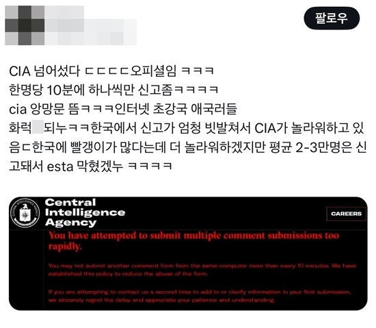 (엑스포츠뉴스 윤채현 기자) 한 누리꾼이 CIA(미국 중앙정보국)에 최근 윤석열 대통령 탄핵에 대한 의사를 밝힌 아이유를 반복 신고하자 CIA 측에서 제한 조치를 내린 것으로 보인다.