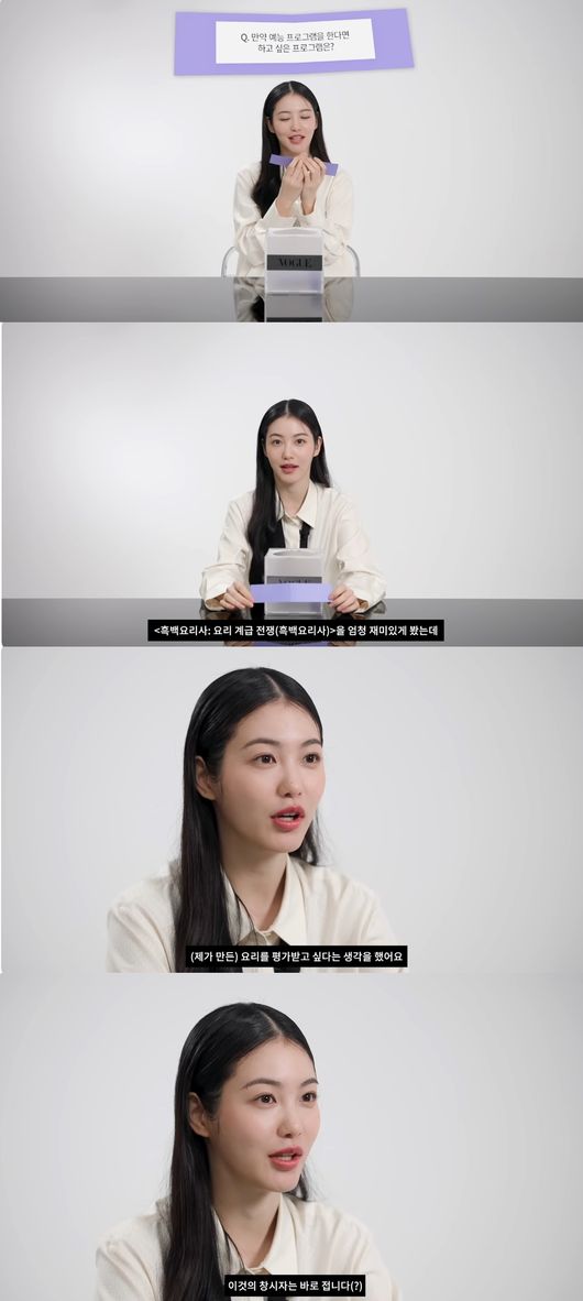 '보그' 영상"주변 사람들이 제 요리를 먹고 맛있다고, '흑백요리사' 나가도 될 정도라고 하는데 그 말이 진짜일지, 제 요리 점수는 어느 정도 일지 너무 궁금하다"며 청국장찌개, 차돌 덮밥, 순두부찌개, 김치볶음밥, 오일파스타(면의 익힘 정도) 등을 요리로 내어보고 싶다고 알렸다.