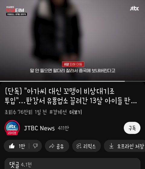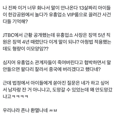 13살짜리 아이들이 한강공원에서 노는 와중에 유흥업소 vip룸으로 끌려가서 성착취 당했었음 당시에 jtbc에서 크게 뉴스도 나왔는데 지금은 잠잠해짐