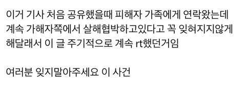 그리고 가해자들이 피해자들 가족한테 현재 살해협박 중이라서 피해자 가족들이 이 사건 안 묻히게 도와달라고 널리 알려달라고 하시는 중임 제발 이거 주변에 알려줘
