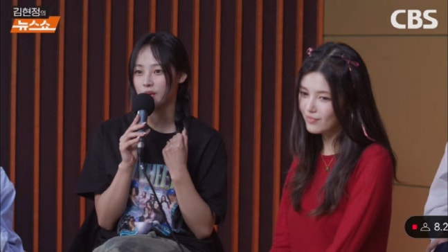(사진=CBS 라디오 ‘김현정의 뉴스쇼’ 유튜브 화면)이밖에도 민지가 영어로 ‘MINHEEJIN’이라는 글귀가 적힌 티셔츠를 입고 등장해 눈길을 끌었다. 민지가 입은 티셔츠에는 민희진 어도어 전 대표의 첫 기자회견 사진과 멤버들의 사진이 함께 담겨 시선을 사로잡았다.이날 ‘김현정의 뉴스쇼’에서는 ‘뉴진스’라는 팀명 대신 민지, 하니, 다니엘, 해린, 혜인 등 멤버들의 이름을 사용했다. 뉴진스 멤버들도, 김현정 앵커도 ‘뉴진스’라는 팀명을 언급하지 않았다.