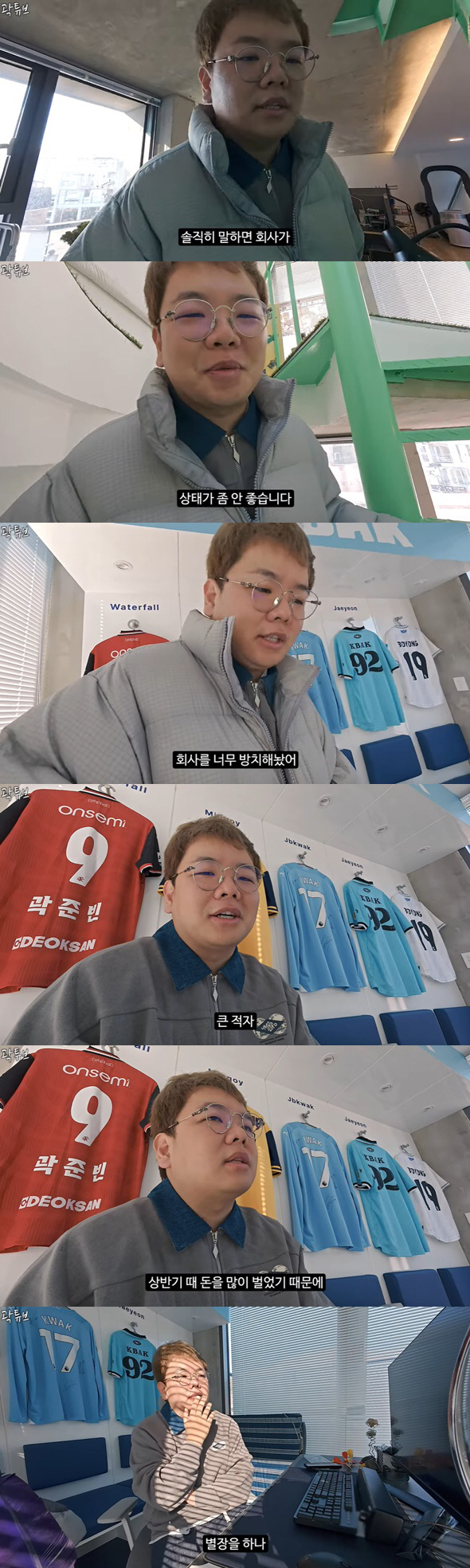 자신이 설립한 회사 '곽컴퍼니'의 사무실에서 등장한 곽튜브는 "직원이 3명 있는 회사다"라며 "솔직히 말하면 회사가 상태가 안 좋다. 회사를 너무 방치해놨다"고 반성했다.