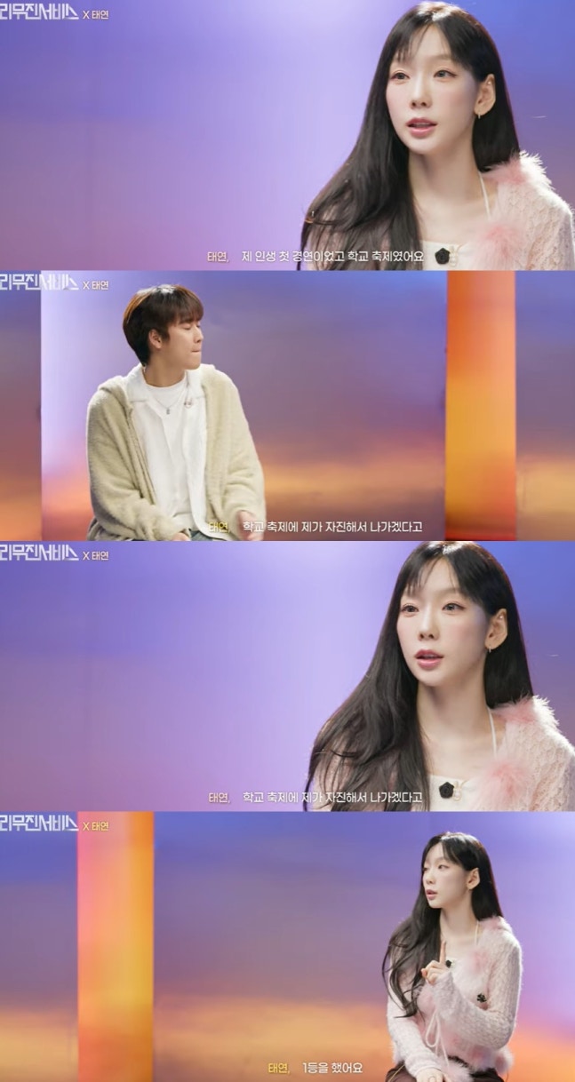 태연은 "중학교 1학년 때 제 인생 첫 경연이었고 학교 축제였다. 자진해서 나가겠다고 친구랑 같이 듀엣을 했는데 1등을 했다"고 윤미래의 '시간이 흐른 뒤'를 선보였다고 덧붙였다.