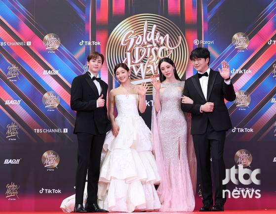 닉쿤, 박소담, 이다희, 성시경이 7일 오후 태국 방콕 라자망갈라 국립 경기장에서 열린 〈제37회 골든디스크어워즈〉 레드카펫 행사에 참석해 포즈를 취하고 있다. 사진=골든디스크어워즈 사무국 / 2023.01.07/