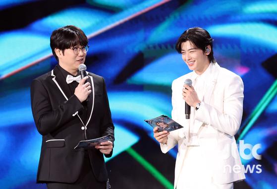 가수 성시경, 차은우가 6일 오후 인도네시아 자카르타 인터내셔널 스타디움에서 열린 '38회 골든디스크 어워즈 with 만디리' MC를 맡아 진행하고 있다. 사진=골든디스크어워즈 사무국 / 2024.01.06/