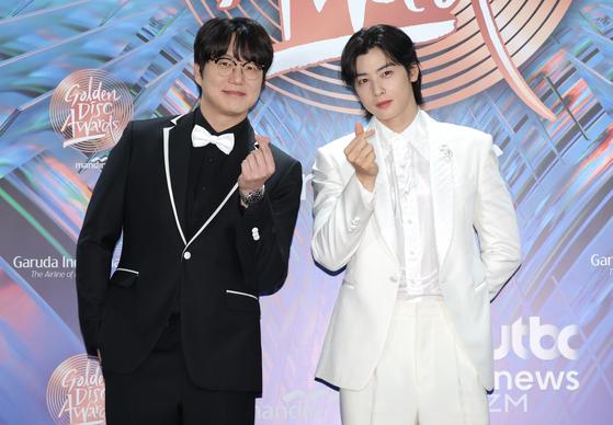 가수 성시경, 차은우가 6일 오후 인도네시아 자카르타 인터내셔널 스타디움에서 열린 '38회 골든디스크 어워즈 with 만디리' 레드카펫에서 포즈를 취하고 있다. 사진=골든디스크어워즈 사무국 / 2024.01.06/