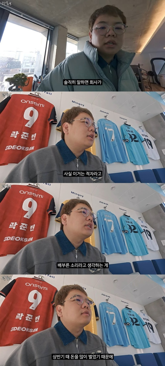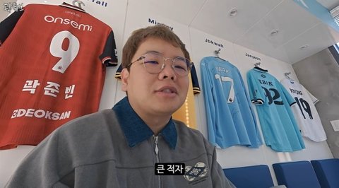 사진 = 유튜브 채널 '곽튜브'곽튜브는 "솔직히 말하면 회사가 상태가 좀 안 좋다. 회사를 너무 방치해놨다"라며 "실제 계약한 크리에이터들의 유니폼인데 사실 한 명이 더 있는데 누구를 지금 케어할 상황이 아니라서 그분께 죄송하다고 말하고 보류 중이다"고 설명했다.