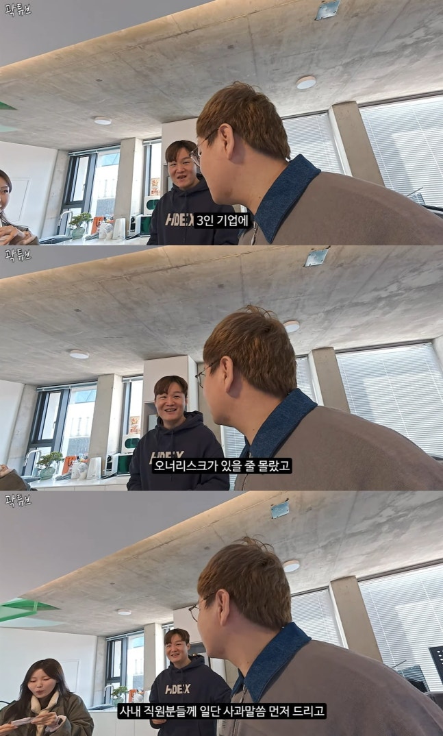 소속 크리에이터가 "아무리 기둥이 무너지고 흔들려도 그렇지. 대표님 계신데"라며 농담식으로 얘기하자 곽튜브는 "누가 무너(지냐). 나도 이런 3인 기업에 오너리스크가 있을 줄 몰랐고, 이 정도 15평짜리 기업에서 오너 리스크가 있었던 점 우리 사내 직원분들께 사과 말씀 드린다"고 사과했다.