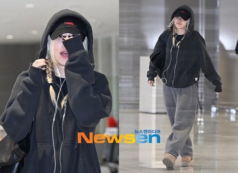 최근 로제는 오버사이즈 블랙 후드 집업을 활용한 캐주얼한 공항 패션을 선보였다.