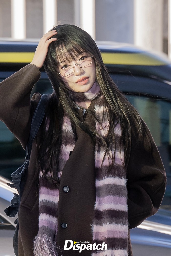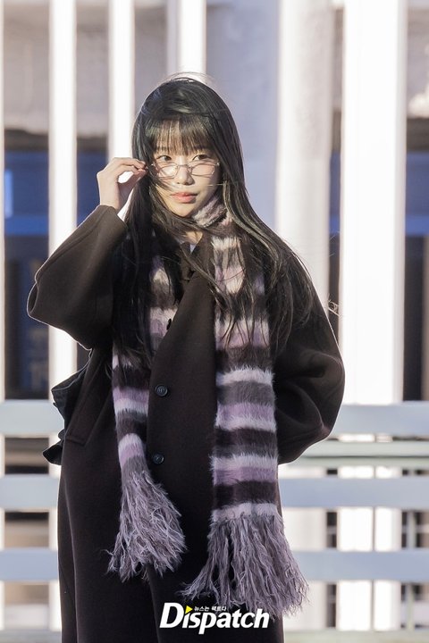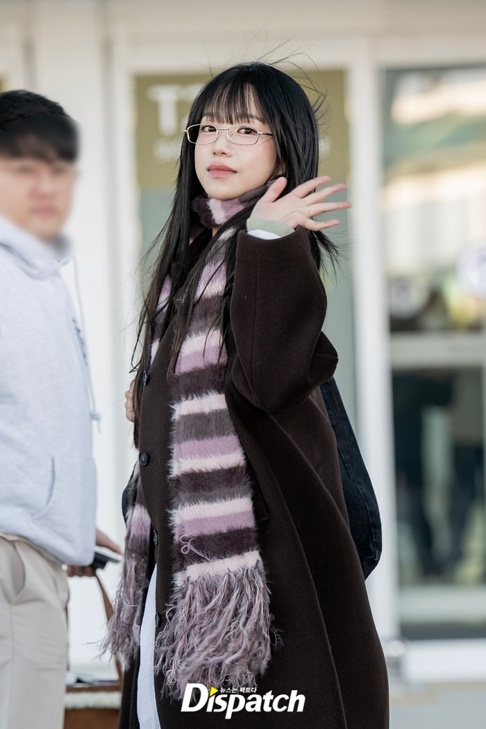 조유리는 브라운 재킷과 스트라이프 머플러로 멋을 냈다. 인형같은 비주얼이 돋보였다.