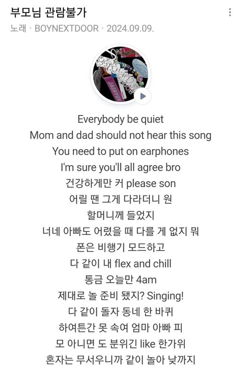 아이돌 그룹 노래인데 제목부터가 '부모님 관람불가'인데다 가사도 통금 새벽 4시, 밤새도록 놀겠다는둥 완전히 비행청소년들이 일탈하는 내용이네요... 호기심 많은 사춘기 아이들이 이런 노래 들으면 그런 행동 해보고 싶은 마음 생길 수도 있는데 이런 노래를 내는건 진짜 미친 거 아닌가요? 애들을 나쁜 길로 빠뜨리는 노래네요..