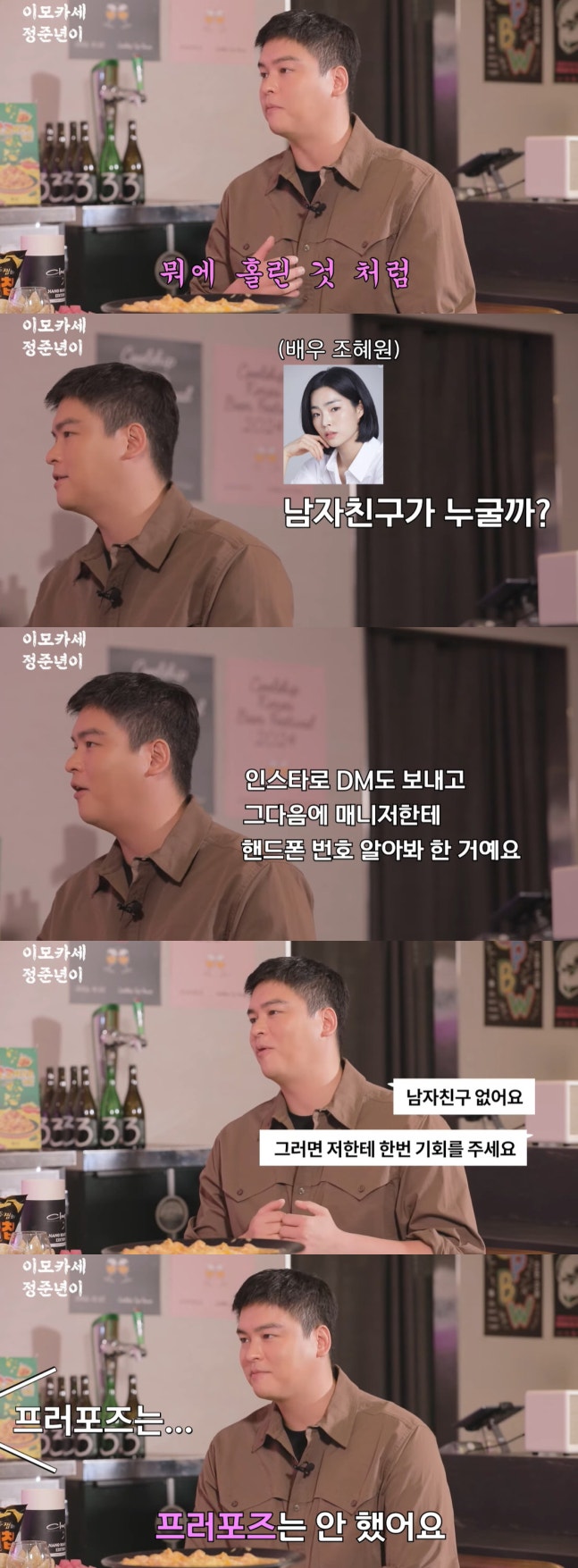 이장우는 "근데 매니저가 회사도 어딘지 모르겠고, 연락처를 받기 어렵다고 하는 거다. 고민하는데 DM으로 '누구세요?'라는 답장이 왔다. 보낸 사람이 진짜로 나인지 몰라서 그런 거였다. 그래서 내가 '같이 촬영했던 이장우라고 한다. 드라마 나와주셔서 감사하다'고 했다. 그렇게 DM을 보내면서 '혹시 남자 친구 있냐'고 했더니 1시간 후에 '없다'고 해서 '그러면 나한테 한번 기회를 달라'고 했다. 저녁 식사를 할 수 있는 기회를 달라고 해서 같이 저녁 먹으면서 좋은 관계로 발전하게 됐다"고 밝혔다.이를 들은 정준하는 "나도 서현철 선배가 우리 아내를 처음 만난 날 같이 있었다. 화장실 가는 사이에 나한테 '저 여자 어떻게 생각하냐. 저 여자 잡아라' 그 얘기 한 마디에 간 거다. 어른들이 보는 게 있다. 선배들이 보는 눈이 있다. 물론 나도 반했으니까 그 자리에 같이 있었지만"이라며 공감했다.