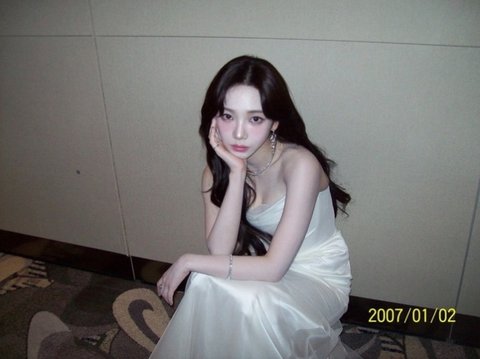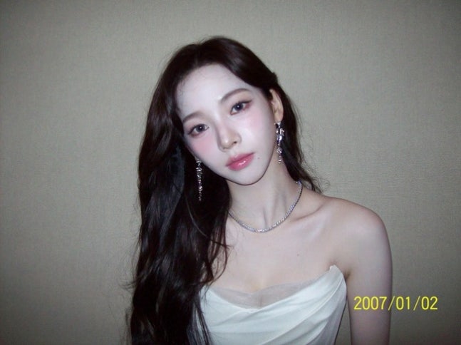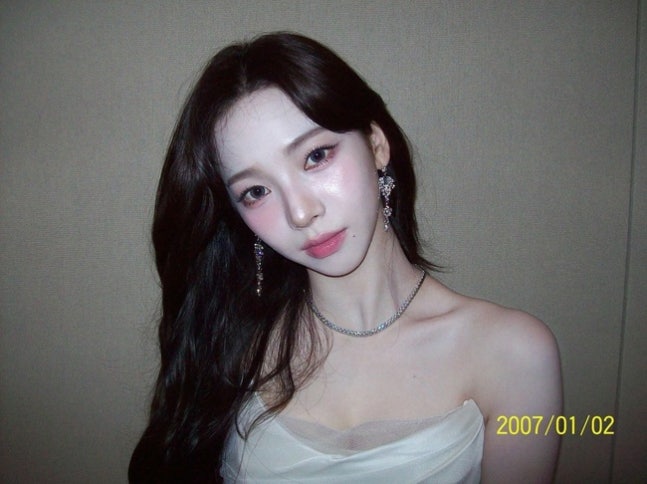사진=에스파 카리나 소셜미디어공개된 사진에서 카리나는 여리여리한 어깨 라인이 드러나는 흰색 오프숄더 실크 드레스를 입고 다양한 포즈를 취했다.