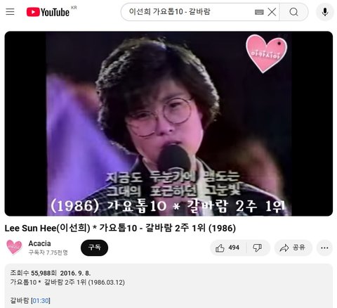(사진8 설명) Lee Sun Hee(이선희) * 가요톱10 - 갈바람 2주 1위 (1986)