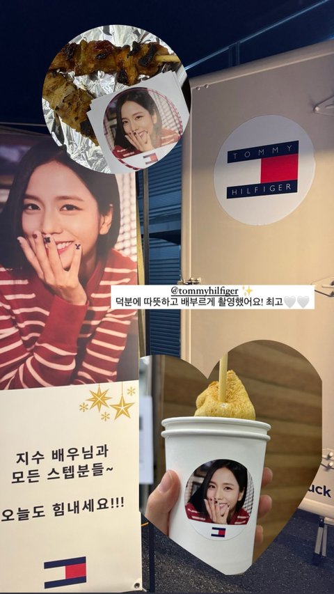 어제 타미힐피거 어묵과 닭꼬치도 보냈냄 지수도 현재 촬영중인 스태프분들에게 모자 선물했어 너무 부럽네ㅋㅋ 지수와 함께 일하는 사람들 항상 좋은 대우 받을거같은데