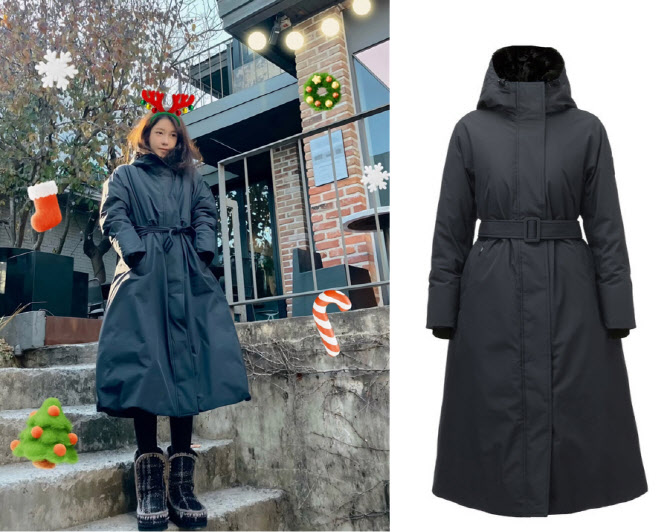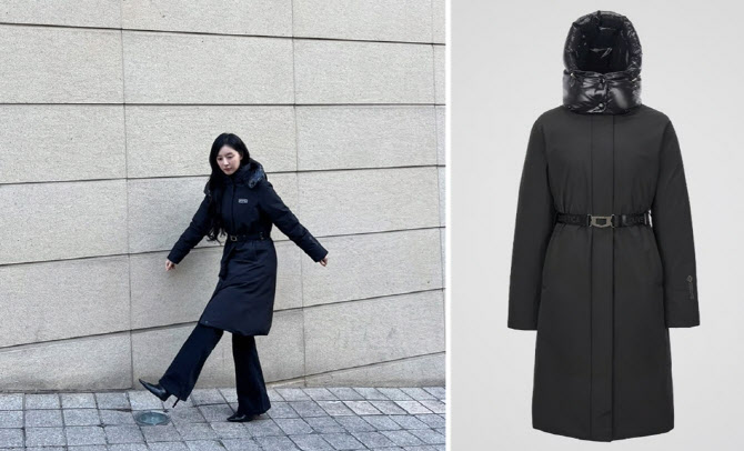 폭스 벨티드 롱 다운은 탈부착 가능한 허리 벨트와 슬림한 실루엣이 특징이다. 구스 다운이며 목 부근엔 폭스 퍼로 보온성을 높였다. 기은세는 올리브 색상을 착용했으며, 블랙 색상도 있다. 가격은 정가 기준 120만원이다.