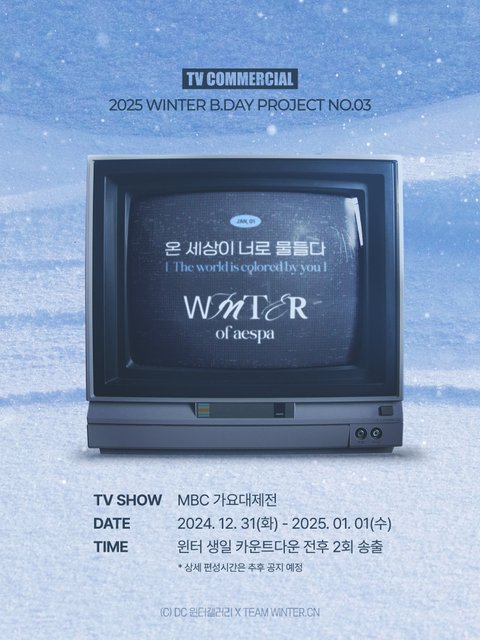윈터는 생일이 1월1일이라 데뷔 이후 생일을 항상 가요대제전에서 맞아왔는데 이번에 팬들이 윈터 생일을 기념해서 12월 31일 가요대제전 새해 카운트다운 세는 전후로 생일 축하 TV광고 영상 집어넣었대.. 새해 카운트다운 하기 전에 모든 출연자 무대로 다 모이는데 다같이 윈터 생일 축하 영상 보게 생김ㅋㅋㅋㅋㅋ 전에 무슨 2호선 지하철 대여해서 윈터 사진이랑 생일 축하 글귀로 꾸민 것도 봤는데 팬들이 이벤트 선정을 진짜 잘하는 것 같음